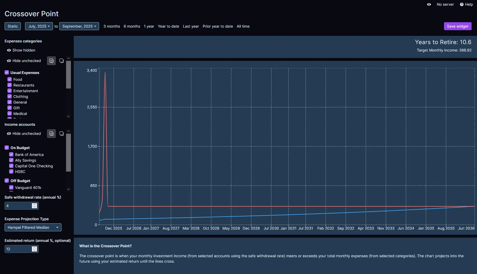 The Crossover Point Report is a financial planning tool inspired by the "Your Money or Your Life" methodology. This report helps users visualize when their passive income from investments will be sufficient to cover their projected expenses, marking the point where they achieve financial independence.